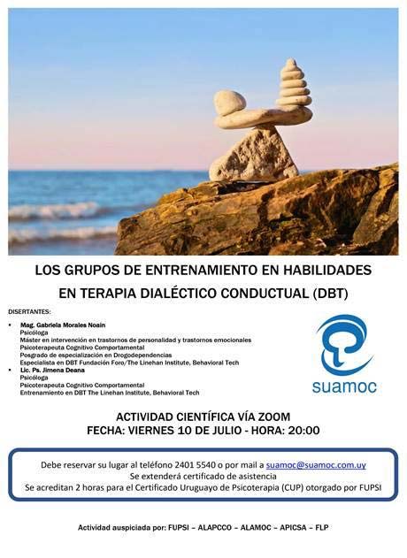 Calendario de actividades Próximas actividades No hay actividades programadas Actividades pasadas Grupos de Habilidades de DBT El viernes 10 de julio vamos a estar hablando sobre los Grupos de Habilidades de DBT. Actividad organizada por SUAMOC, por plataforma Zoom. L@s esperamos!!! 14 Jul 20 20:00 hs